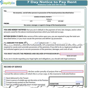 Alabama Notice to Pay Rent – What should be included?The Alabama Notice to Pay Rent Form must contain the amount of money owed, what it is owed for, and the amount of time the tenant has. The notice must be clearly stated and conspicuously posted so the tenant has reasonable awareness and can take decisive action.