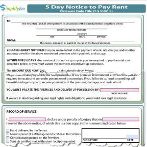 Delaware Notice to Pay Rent – What should be included?The Delaware Notice to Pay Rent Form must contain the amount of money owed, what it is owed for, and the amount of time the tenant has. The notice must be clearly stated and conspicuously posted so the tenant has reasonable awareness and can take decisive action.