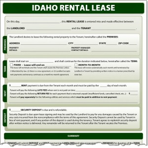 Idaho Rental Lease - What should I Know?You can read Idaho Landlord and Tenant Guidelines to become familiar with some of the laws that govern Idaho leases. The first thing you'll want to find out is whether your Idaho Lease Contract is a fixed term Idaho lease agreement or a month-to-month Idaho rental agreement. Many Idaho Residential Lease Agreements last for a fixed term and then automatically continue month-to-month until the tenancy is ended by the Landlord or the Tenant. You should examine your lease contract to see if it includes any terms for automatic renewal. All Idaho Rental Leases must include the address of the rental property, names of the tenants who will be living there, how much rent they will be paying, and the initial agreed upon duration for the lease agreement. It should also include details regarding the security deposit and other terms and conditions that will govern the agreement. Idaho Rental Leases and Landlord Tenant LawsFederal law requires Idaho landlords to disclose any lead paint on their residential lease agreement if the property was built before 1978. You can learn more about Idaho tenant rights and protections from the Idaho Department of Housing and Urban Department website. Most states have very specific rules, and Idaho is no exception. Read Title 6 and Title 55 - Idaho Code to learn more. |