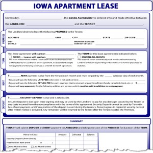 Iowa Apartment Lease Forms are used by Iowa property management companies when renting apartments to tenants. Click on the image above to take a closer look at the apartment lease, and download the Iowa lease agreement for free by going back to the previous page and clicking on the green download button. If you would like to purchase a custom designed Iowa Residential Lease or Iowa Lease Contract, please send an email to forms@simplifyem.com.