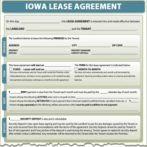 Iowa Lease agreement - contract form used by property management companies or property managers for renters who will have possession of the rental property. |