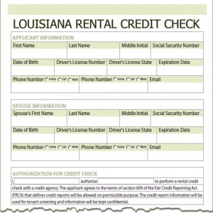 Louisiana Rental Credit Check Form used by Louisiana landlords, Louisiana property managers, and Louisiana property management companies to perform a rental credit check on prospective tenants in Louisiana. The Louisiana rental credit check form must be filled out and signed by prospective tenants to get authorization to check credit history.