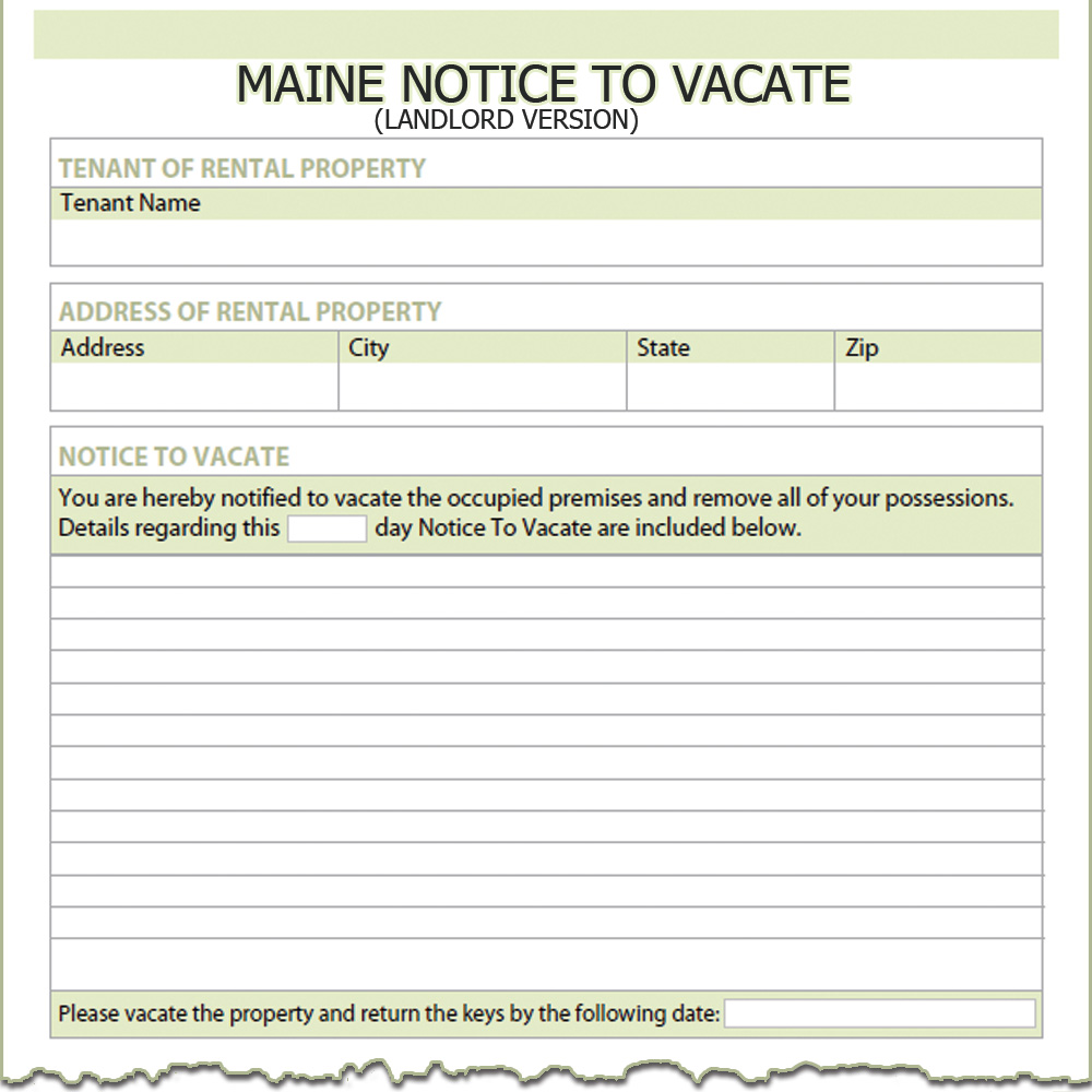 Maine Landlord Notice to Vacate Form used by Maine landlords, Maine property managers, and Maine property management companies to notify tenants in Maine that they must vacate the rental property and remove all of their possessions within 30, 60, or 90 days.
