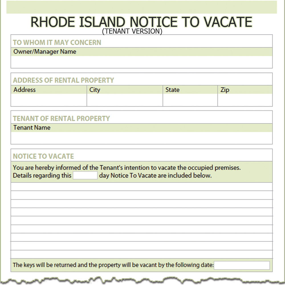 Rhode Island Tenant Notice to Vacate Form used by tenants to notify Rhode Island landlords, Rhode Island property managers, and Rhode Island property management companies of their intent to vacate the rental property and return the keys within 30, 60, or 90 days.
