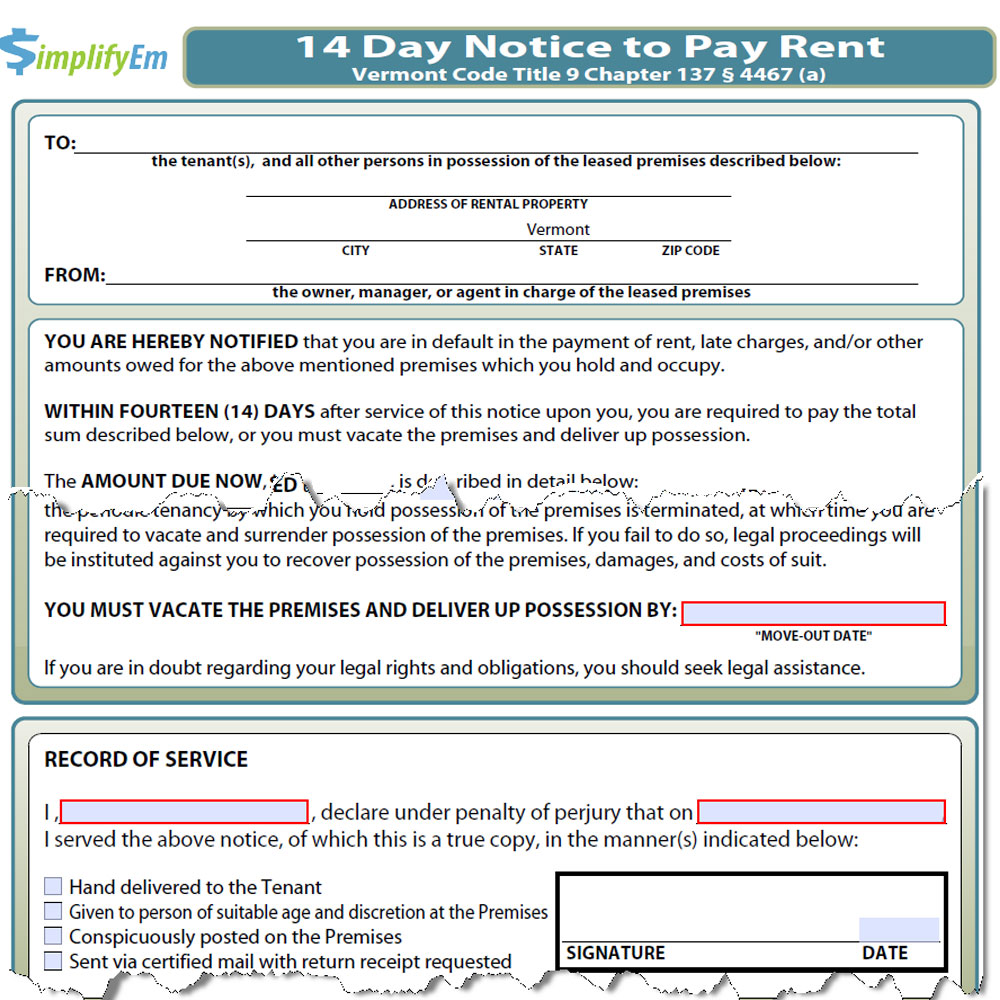 Vermont Notice to Pay Rent – What should be included?The Vermont Notice to Pay Rent Form must contain the amount of money owed, what it is owed for, and the amount of time the tenant has. The notice must be clearly stated and conspicuously posted so the tenant has reasonable awareness and can take decisive action.