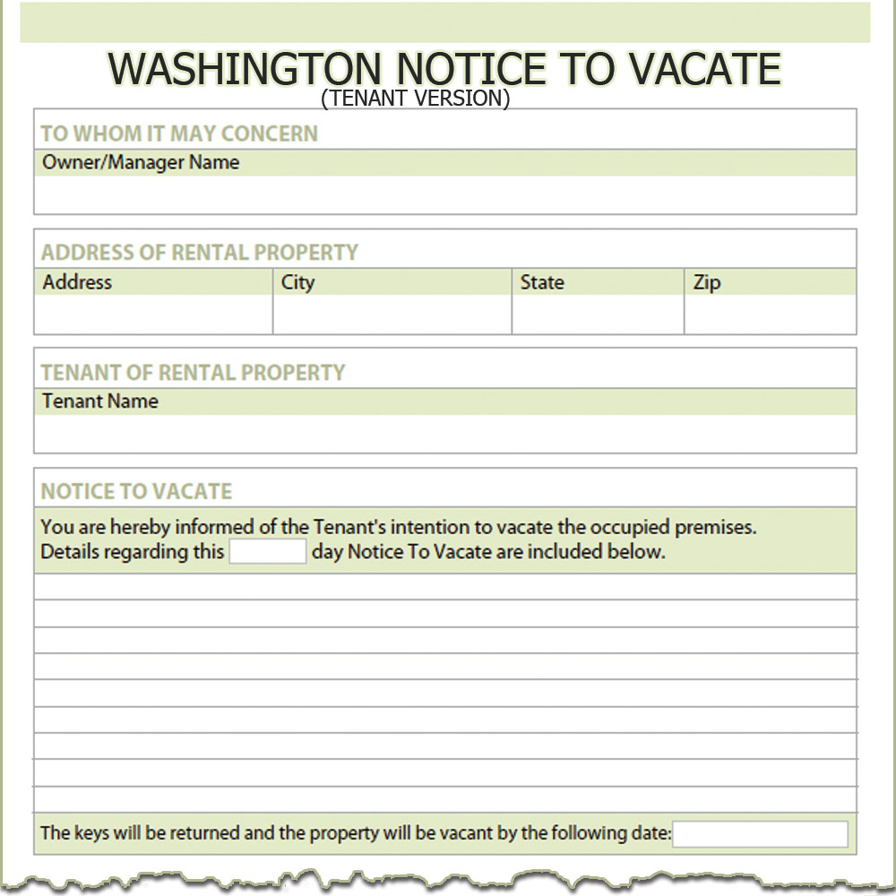 Washington Tenant Notice to Vacate Form used by tenants to notify Washington landlords, Washington property managers, and Washington property management companies of their intent to vacate the rental property and return the keys within 30, 60, or 90 days.