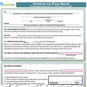 Wyoming Notice to Pay Rent – What should be included?The Wyoming Notice to Pay Rent Form must contain the amount of money owed, what it is owed for, and the amount of time the tenant has. The notice must be clearly stated and conspicuously posted so the tenant has reasonable awareness and can take decisive action.