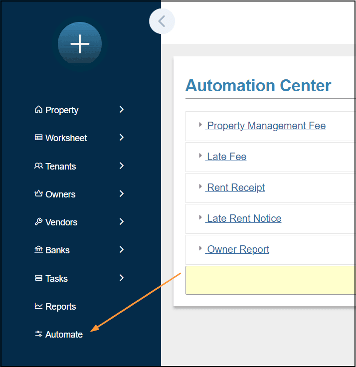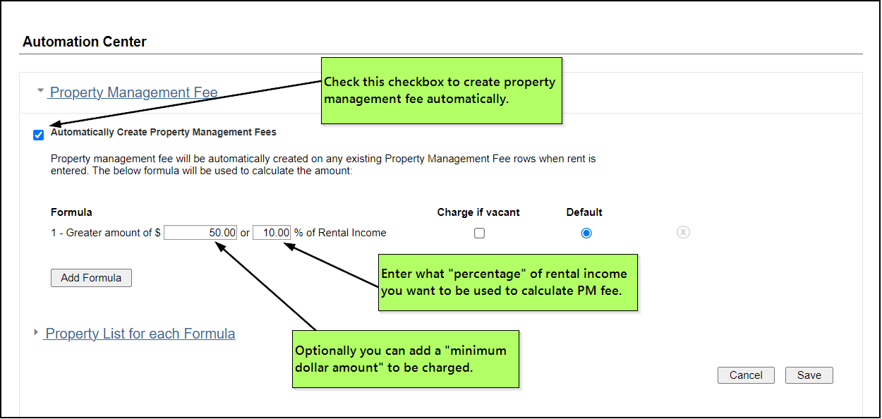 2.This will take you to ‘Automation Center’ page. a.Here check ‘Automatically Create Property Management Fees’ Checkbox b.Define PM fee formula: Enter what “percentage” of rental income you want to be used to calculate PM fee. Optionally you can add a “minimum dollar amount” to be charged.