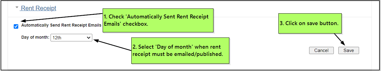 3.This will take you to ‘Automation Center’ page. Click on ‘Rent Receipt’ link. a.Check ‘Automatically Send Rent Receipt Emails’ checkbox. b.Select the Day of month the Rent Receipt should be emailed/published. Here I selected 7th.(Today is July 2nd) c.Click Save button.