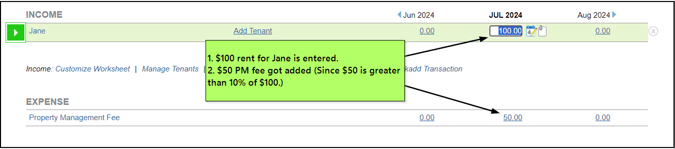 5.Goto Property Worksheet. For Jane,I enter $100 rent for current month(Aug). $50 PM fee gets added (Since $50 is greater than 10% of $100)