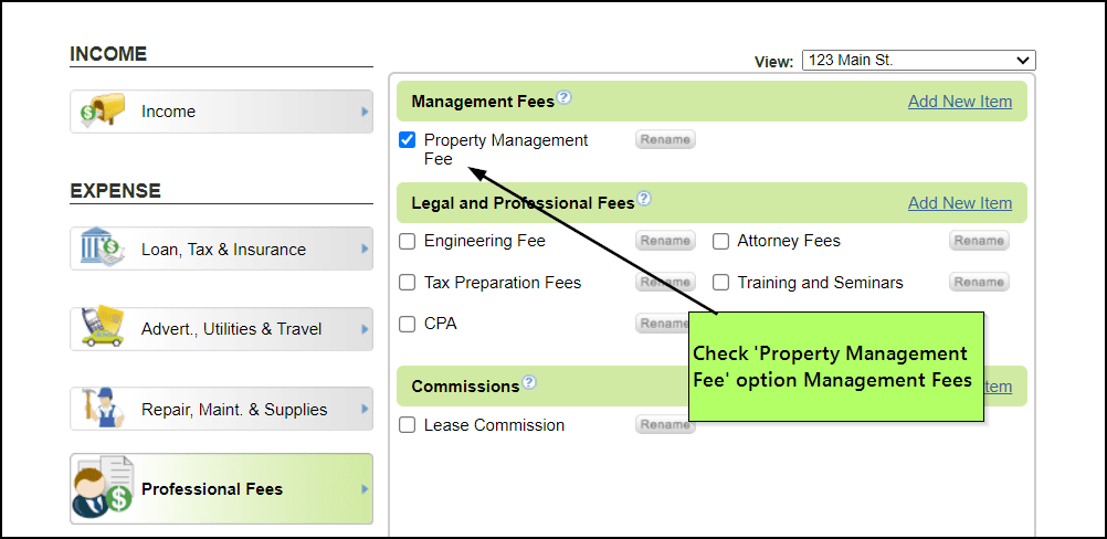 Ex: SamPM defines PM fee as 10% of the rent income with minimum $50. c.There is option to activate “Charge if vacant” (checkbox). If “Charge if vacant” is checked and there is a minimum amount set, the PM fee will be automatically added when tenant is late (rent income = $0 for that month). Instead, if I check “Charge if vacant” and Jane does not pay rent for Current month(July). Next month 1st (Aug 1st) $50 min Late fee will be added. Here I have left ‘Charge if vacant’ unchecked. 3.Click Save. 4.Goto Customize Worksheet and check mark ‘Property Mangement Fee’ under Professional Fees.