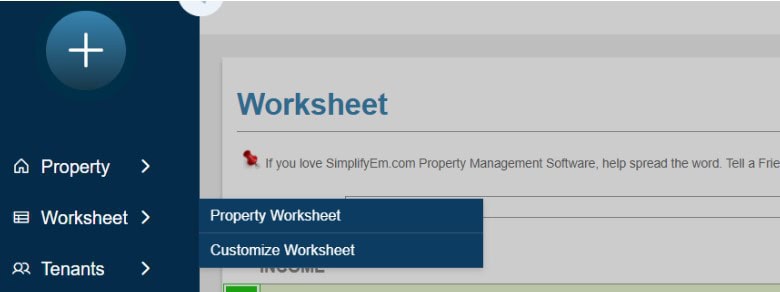 To create rows on the worksheet, first go to the “Customize Worksheet” page for the selected property. This page is automatically displayed after adding a new property, but you can also access it by clicking on the “Customize Worksheet” link found under the Income or Expense sections of the property’s worksheet.