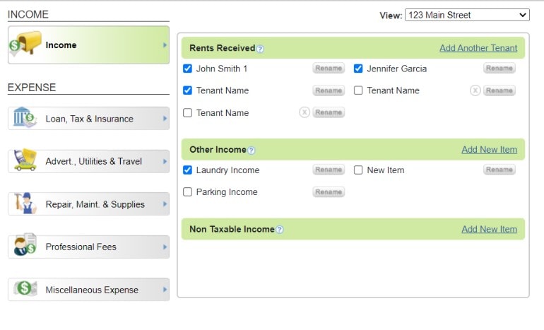 On this page, you can select items that are commonly associated with the property, such as transactions you expect to occur throughout the year. When you choose an item, SimplifyEm.com automatically adds a row to your worksheet for tracking that specific transaction. If needed, you can rename the items by clicking the “Rename” button. As you make selections, the “Preview of Worksheet” widget on the right side of the page will show the newly created rows in real time.