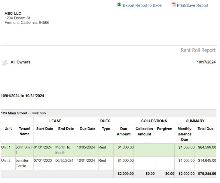 The Rent Roll Report will open in a new window. To keep a copy for your records, you can print it by clicking the “Print Report” link, located at the top right of the report window. This report is a valuable tool for staying organized and ensuring all tenant balances are properly tracked and managed each month.