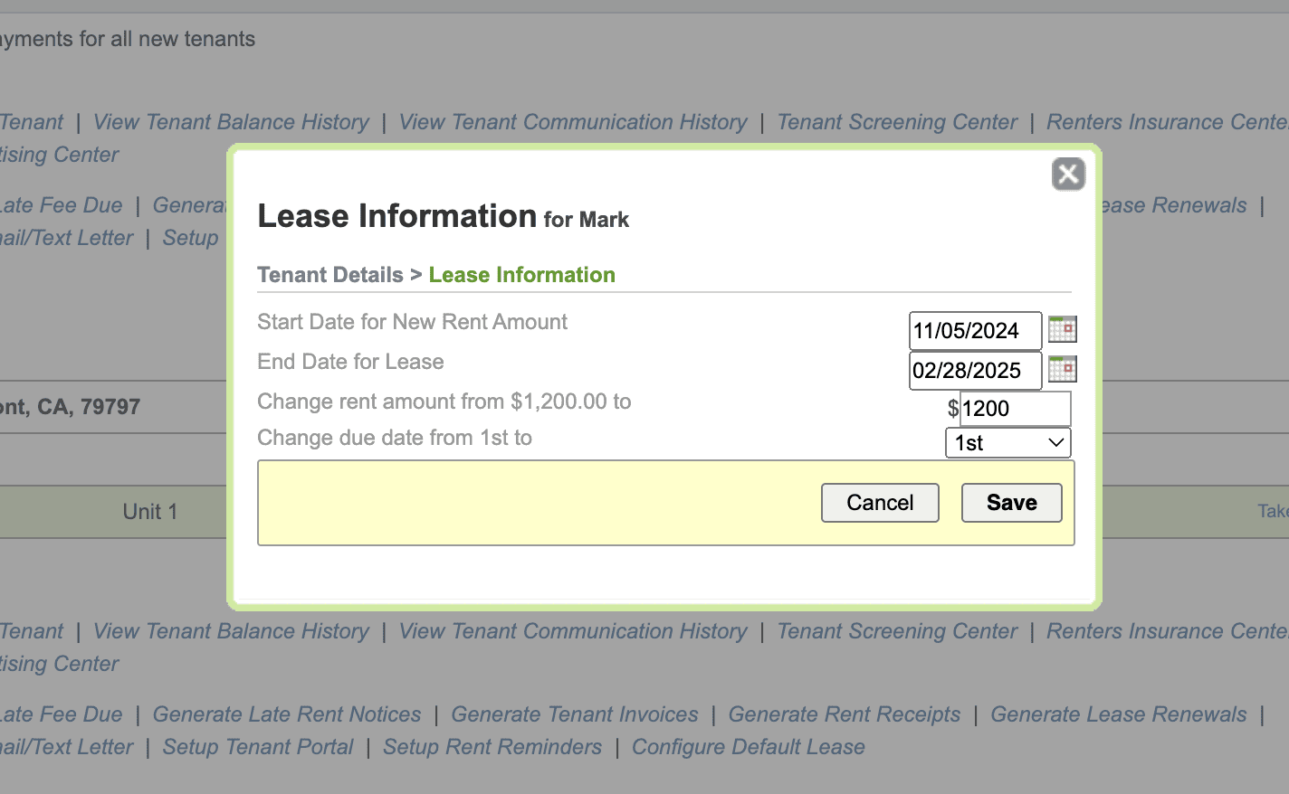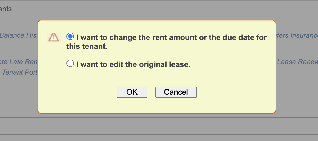 - A pop-up window will appear. Choose the option labeled “I want to change the rent amount or the due date for this tenant.”