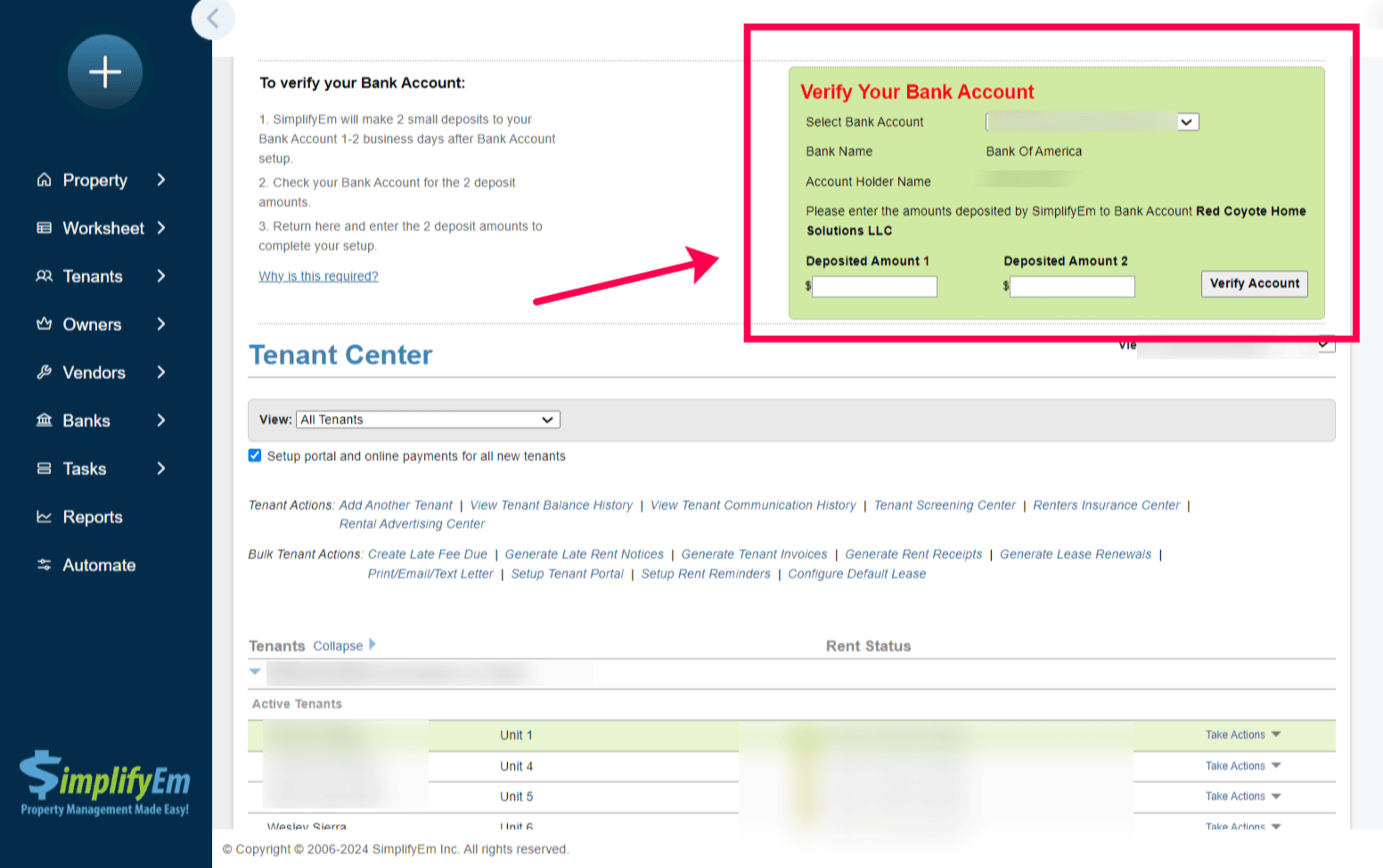 You can verify your bank account using the deposits from Tenants tab >> Tenant Center