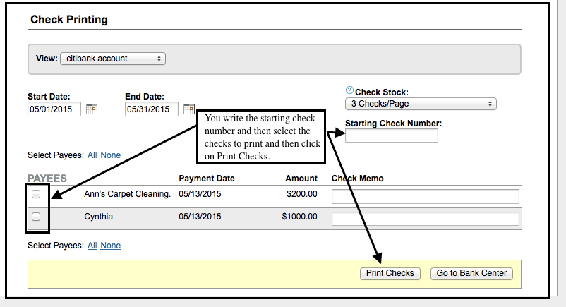 To print checks for a bank account in SimplifyEm, you need to select the appropriate check stock. This can be done while setting up your bank details or, if the bank account is already configured, by going to the Bank Center. Select the bank, choose “Edit Bank Details” from the “Take Actions” menu, and then select the check stock under the “Print Checks” link.