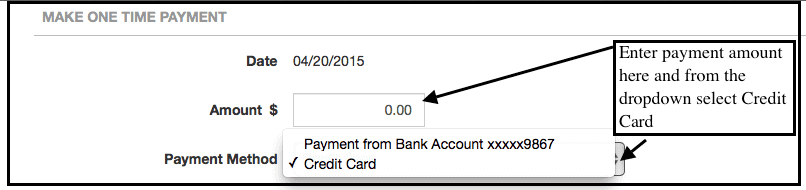 Once online rent payment is enabled, tenants can make a one-time payment through the system. To pay with a credit card, they need to navigate to the “MAKE ONE TIME PAYMENT” section. Here, they should enter the amount they wish to pay and select “Credit Card” from the available payment methods in the dropdown menu.