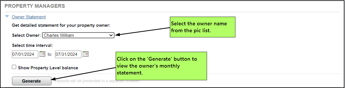 3. Scroll down to the “Property Managers” section, expand “Owner Statement,” and select the owner’s name.