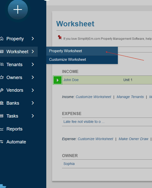 Once a tenant’s lease information is entered into SimplifyEm.com Property Management Software, you can easily allocate rent payments and reconcile received payments with the expected amounts based on the lease. To allocate payments, go to the worksheet page and click the calendar icon next to the payment cell, and then click allocate.