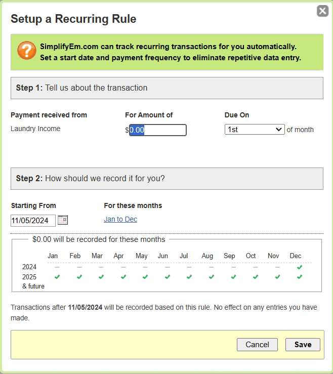 - Enter the payment amount, the “Due Date” when the transactions should begin for recording these payments. Then, save the rule.