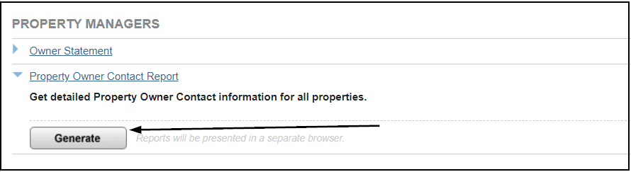 - Scroll to the Property Manager section and expand the Property Owner Contact Report option.